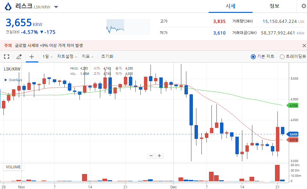 리스크는 현재 3655원대에서 거래되고 있습니다. 2018년도에 높았던 가격에 비해 현재는 많이 떨어진 상태입니다.