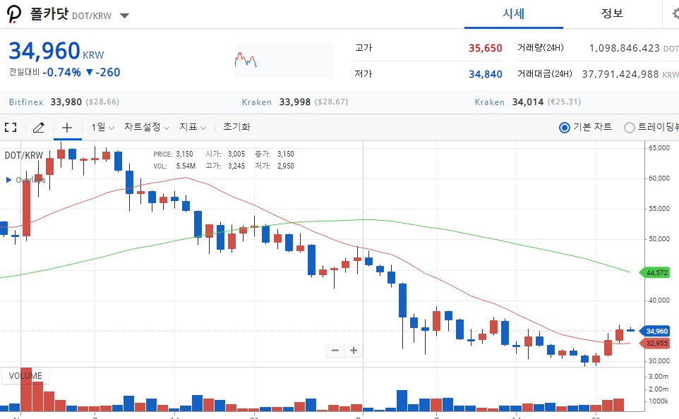 폴카닷은 현재 35000원대 즘에서 거래되고 있습니다. 상승세를 곧잘 이어왔지만 현재는 하락세를 맞고 있습니다.