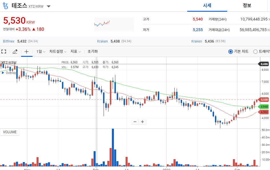 테조스는 현재 5,500원대에 거래되고 있습니다. 지난 9월 10,000원이 넘는 가격까지 급등한 반면 현재는 절반 이상으로 떨어진 상태이지만 점점 회복하고 있는 모습을 볼 수 있습니다. 시가 총액 규모도 상당히 줄었습니다.
