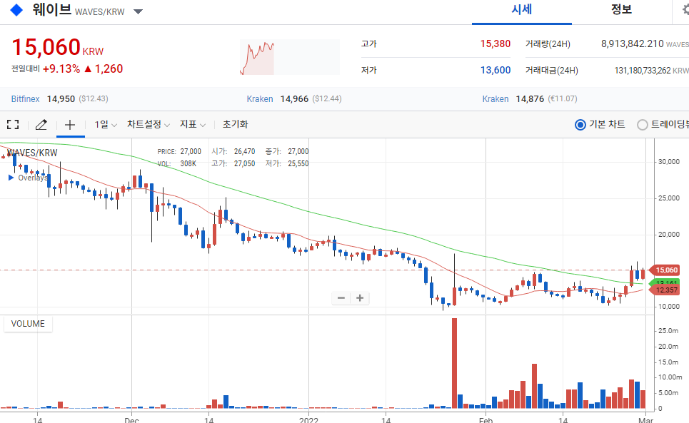 웨이브(WAVES)는 현재 15,000원대에 거래되고 있습니다. 지난 5월 50,000원이 넘는 가격대까지 급등하였다가 얼마 가지 않아 급락하여 현재의 가격대에서 거래되고 있습니다.