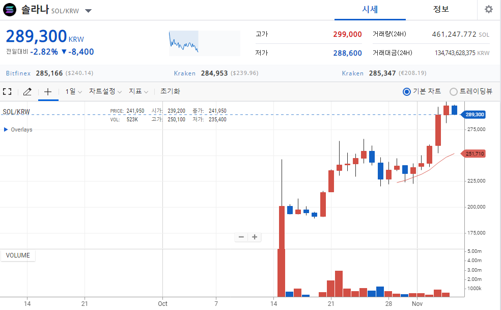 솔라나(SOL) 코인은 현재 289,300원에 거래되고 있습니다 업비트 상장 이후에도 계속 쭉 상승세를 이어가고 있죠